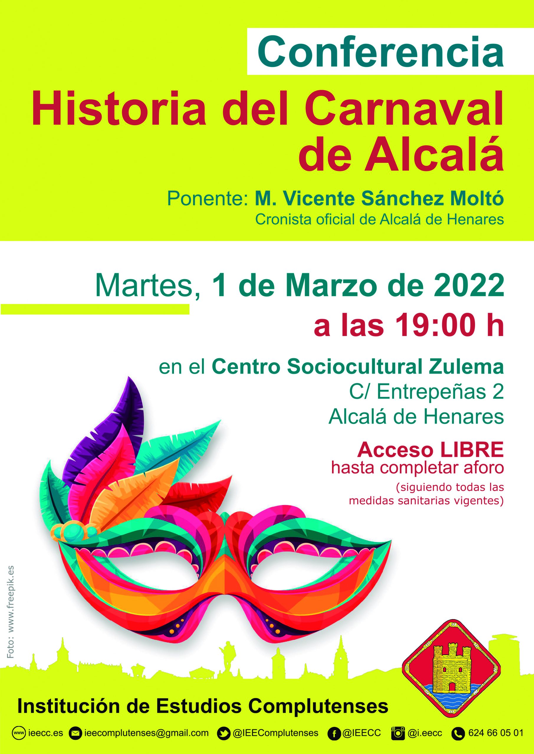 El día 1 de marzo de 2022, tuvo lugar la Conferencia «Historia del Carnaval de Alcalá» incluida en las actividades del Carnaval 2022 de Alcalá de Henares, organizada por la Institución de Estudios Complutenses (IEECC) y el Centro Sociocultural Zulema. La conferencia, fue llevada a cabo por el vicepresidente de la IEECC, Vicente Sánchez Moltó.